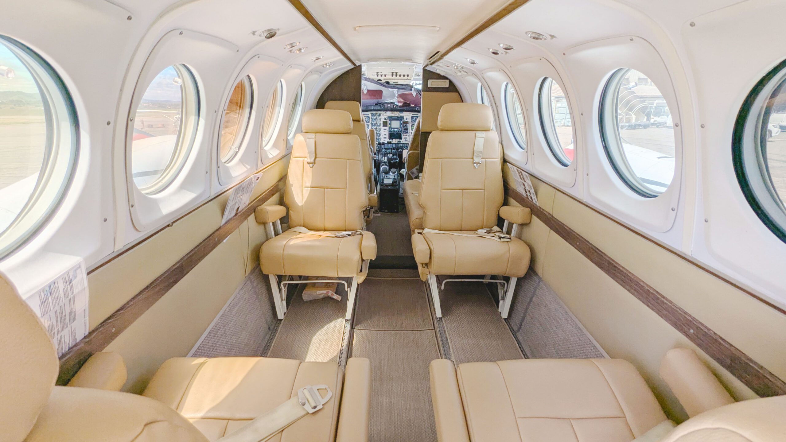 The Super King Air 200 is a twin-engine turboprop with 850 horsepower per engine. It offers two cabin versions: